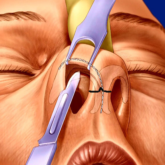 В наши дни открытая пластика носа выполняется через разрезы вертикальной перепонки, разделяющей ноздри (колумеллы). В некоторых случаях приходится делать дополнительные разрезы у основания ноздрей. Этот способ предпочтителен при больших деформациях носа и при повторной ринопластике, хотя применяется и в менее сложных ситуациях.